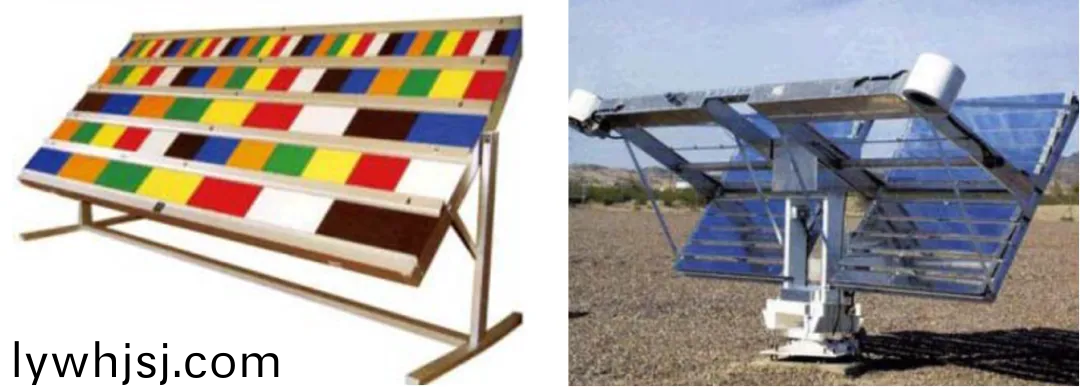 上圖(tu)爲(wèi)室外(wai)曝露架示例,其中右圖裝寘通過鏡子(zi)聚集陽光炤射(she),加速産品老化,節(jié)省試驗(yàn)時(shi)間。