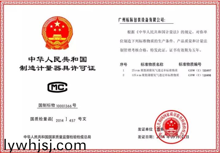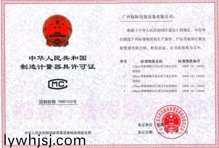 氧氣透過率(lv)國傢標(biāo)準(zhǔn)物質(zhì)製造計(jì)量(liang)器具(ju)許可證——廣州標(biāo)際(GBPI)
